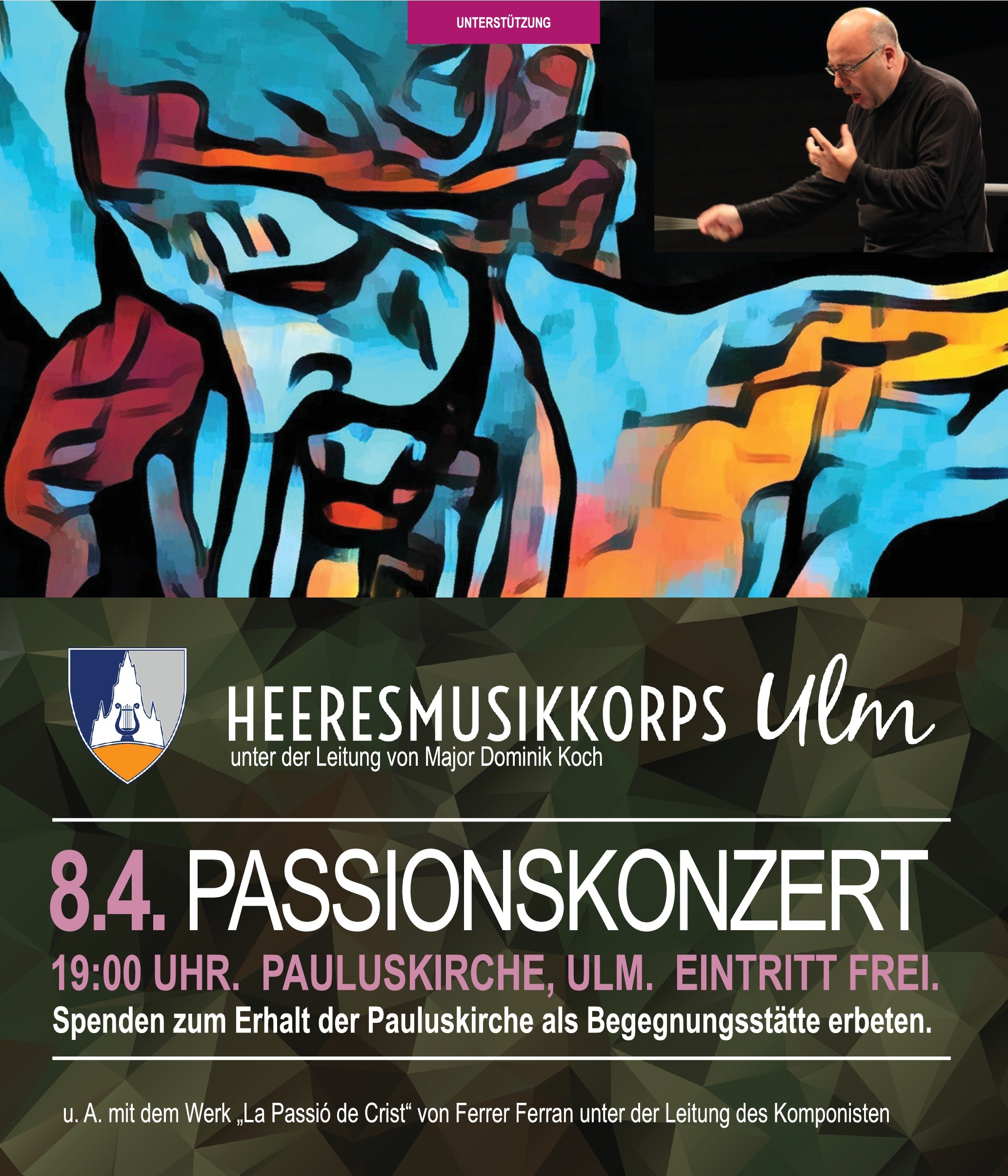 Auf dem Programm stehen großartige Werke: „Die Passion Christi“ vom spanischen Komponisten Ferrer Ferran, der an diesem Abend selbst als Gastdirigent am Pult steht. Ebenso das Largo aus Dvoraks Sinfonie „Aus der neuen Welt“. Dieses Konzert wird als Jubiläumskonzert gefeiert, das Heeresmusikkorps wird 70 Jahre alt. Der Eintritt ist frei, um eine Spende zu Gunsten des Bauerhalts der Pauluskirche als Begegnungsstätte wird gebeten.